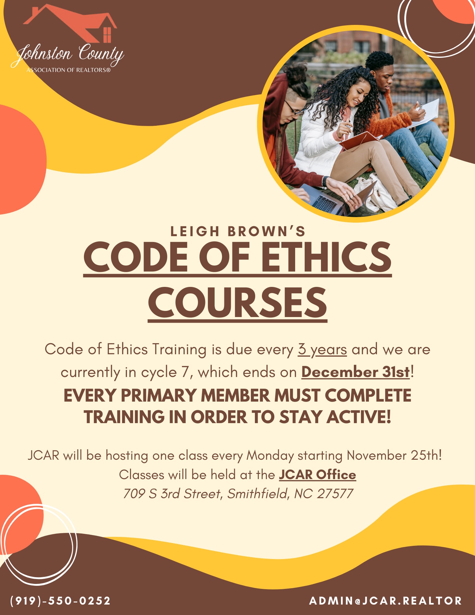 ALL PRIMARY MEMBERS MUST COMPLETE CODE OF ETHICS TRAINING TO STAY ACTIVE! Classes will be held at JCAR Office and refreshments will be provided!Images